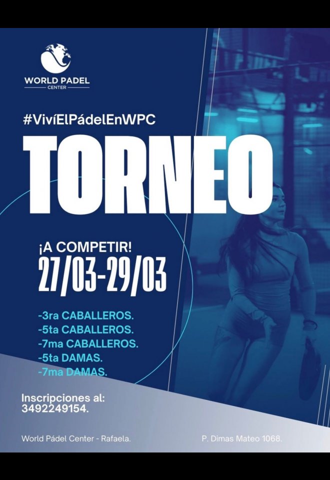 »» Evento: TORNEO WORLD PADEL CENTER RAFAELA - Marzo 2026 »» Localidad: Rafaela »» Fechas: 26/03/2026 al 29/03/2026